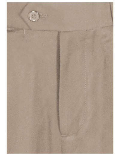 - Single pleat front with double hip back pockets and fob pocket