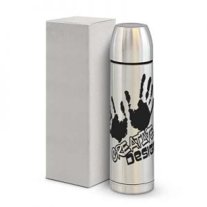The Trends 750ml vacuum flask is a good stainless steel vacuum flask with a screw on cup and convenient push button. Laser engraves. Silver with Black trim. Click here for more flask options