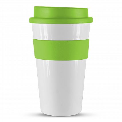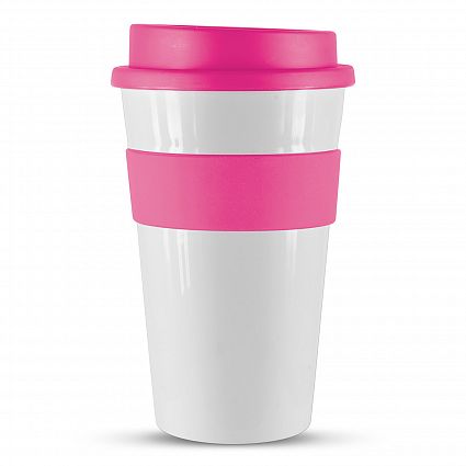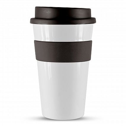 The Trends Express Cup Classic 480ml is a reusable coffee cup with a heat resistant silicone band & screw on lid. Great branded promo product